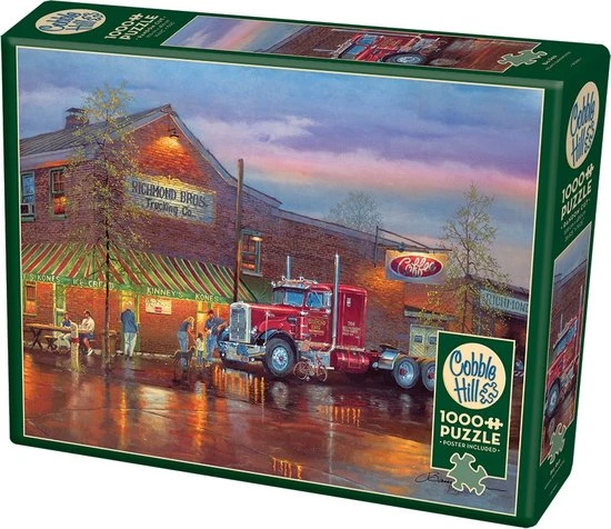 Een rode vrachtwagen stopt voor de ijssalon Kinney’s Kones. Puzzel van Cobble Hill met 1000 stukjes