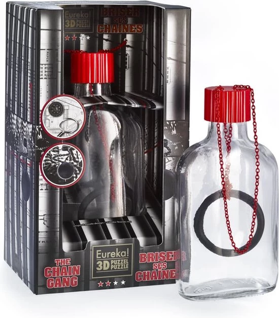 In The Chain Gang** Breinpuzzel is het de bedoeling dat je de zwarte ring van de rode ketting bevrijdt en deze vervolgens weer als gevangene bevestigt. Een Chain Gang was een groep gevangenen die samen geketend waren en zwaar werk moesten verrichten als een vorm van straf. In een poging tot ontsnapping was het essentieel om zichzelf eerst te bevrijden van de kettingen. Kan jij de truck vinden hoe je de rode ketting verlost van de zwarte ring terwijl alles in de fles blijft? Deze puzzel is ontworpen door Sándor Bozóki.