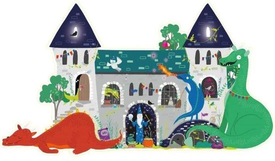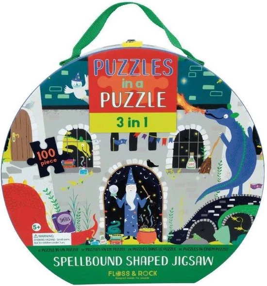 Floss & Rock 3-in-1 Puzzel, Spellbound. Deze leuke puzzels kan je apart maken, maar samen vormen ze 1 geheel! De 2 draken bestaan elk uit 12 stukjes en het kasteel uit 76 stukjes. De puzzel is een uitdaging voor de allerkleinsten. Wij raden daarom aan deze puzzel te laten doen door kinderen vanaf 5 jaar. De puzzel wordt in een leuk koffertje met handvat geleverd. Een fantastisch cadeau voor de fanatieke puzzelaars.