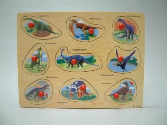 | Verpakkingsinhoud | 1, vormenpuzzel, met, 9, dinosaurussen |