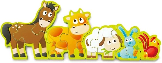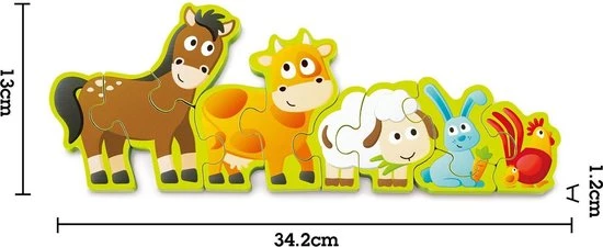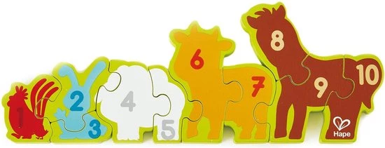Deze houten puzzel heeft tien dubbelzijdige stukken. Aan de ene kant staan boerderijdieren afgebeeld en aan de andere kant de getallen 1 tot en met 10. De puzzel kan rechtop staan op een tafel. Hiermee leert je kind spelenderwijs de getallen!