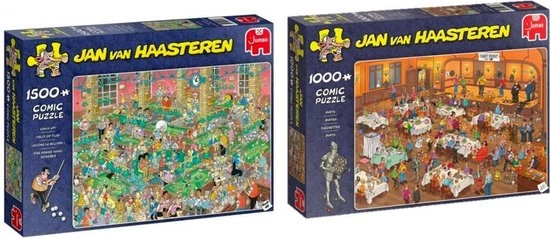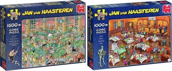 Jan van Haasteren tekent al decennia lang humoristische, kleurrijke platen met veel detail. De doorgewinterde fan zoekt in elke puzzel direct naar de haaienvin, hét handelsmerk van Jan. Om aan de grote vraag naar Jan van Haasteren puzzels te voldoen, wordt er ook getekend door ‘Jan van Haateren studio’ tekenaars. Samen met Jan werken deze tekenaars aan nieuwe dolkomische platen. In de Jumbo collectie vind je tientallen Jan van Haasteren puzzels van 150 tot 3000 stukjes. Heel veel puzzelplezier!