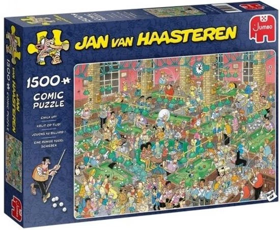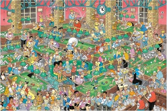 Een hilarische Jan van Haasteren puzzel met de meest chaotische poolbar die je ooit hebt gezien. Niks is gek genoeg voor de Jan van Haasteren puzzels en ook deze puzzel met 1500 stukjes bevat de meest unieke details. Elk hoekje heeft haar eigen detail en maakt deze puzzels super leuk om in elkaar te leggen. Voor een goed potje poolen zit je verkeerd, maar om lachend een puzzel in elkaar te leggen zit je precies goed.