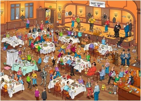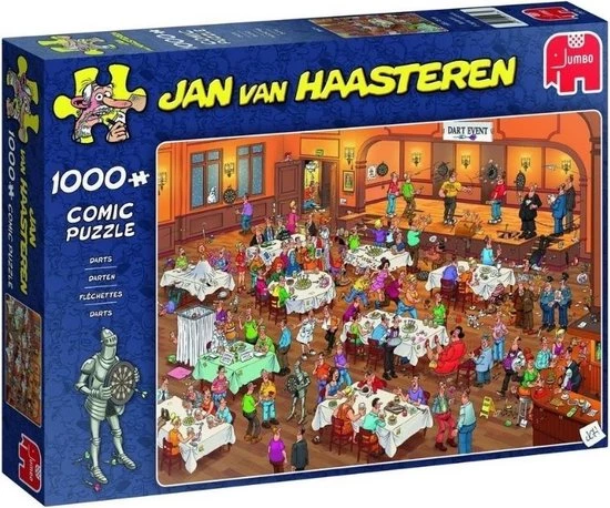 Jan van Haasteren Darts met 1000 Stukjes is een van de nieuwe puzzels van Jan van Haasteren. Tijdens dit Dart toernooi verloopt niet alles even soepel. Darts van Jan van Haasteren puzzel met 1000 stukjes voor de echte Jan van Haasteren fans! Zodra je Jan van Haasteren Darts met 1000 Stukjes begint te puzzelen stuit je op het ene na het andere hilarische tafereel.