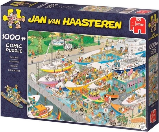 Wat een drukte in De Sluizen van Jan van Haasteren. Als dat maar goed gaat! Een geweldige puzzel met 1000 puzzelstukjes. Tijdens het puzzelen kom je steeds meer grappige details en taferelen tegen. Een kleurrijke plaat waarbij Jan van Haasteren wederom laat zien dat humor op een geweldige manier kan worden verwerkt in een puzzel. Jan van Haasteren puzzels zijn puzzels met veel kleur en details. Jan van Haasteren tekent al decennia lang humoristische platen die je steeds weer verrassen en laten lachen. De echte fans kennen de specifieke kenmerken van Jan van Haasteren en zoeken in elke puzzel direct naar de haaienvin, Sinterklaas, de handjes, het kunstgebit en Jan’s zelfportret. Jumbo heeft tientallen Jan van Haasteren puzzels in de collectie van 54 tot maar liefst 5.000 puzzelstukjes.