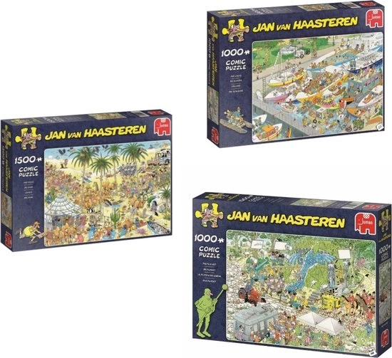 Jan van Haasteren tekent al decennia lang humoristische, kleurrijke platen met veel detail. De doorgewinterde fan zoekt in elke puzzel direct naar de haaienvin, hét handelsmerk van Jan. Om aan de grote vraag naar Jan van Haasteren puzzels te voldoen, wordt er ook getekend door ‘Jan van Haateren studio’ tekenaars. Samen met Jan werken deze tekenaars aan nieuwe dolkomische platen. In de Jumbo collectie vind je tientallen Jan van Haasteren puzzels van 150 tot 3000 stukjes. Heel veel puzzelplezier!