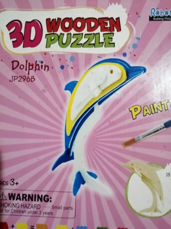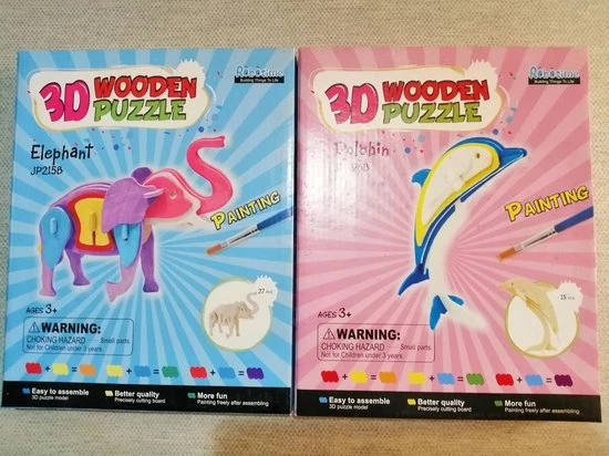2 houten puzzels 3 – dimensioneel , Olifant en Dolfijn , apart te bouwen. Olifant 27 delig en Dolfijn 15 delig.