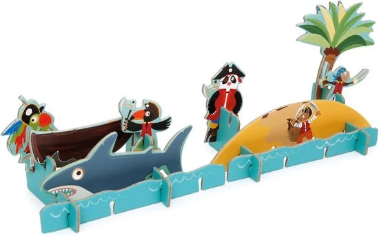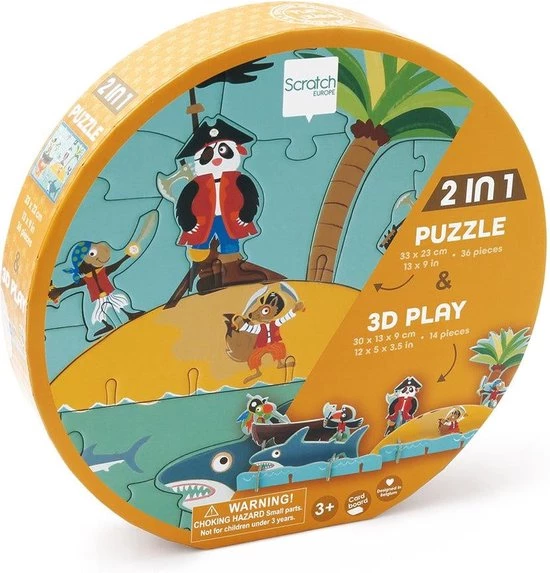 2 puzzels in 1! Puzzel en speel! Maak de prachtige puzzel van 36 stukken en er verschijnen stoere piraten. Je kan de figuren uit de puzzel ook rechtop zetten en zo een puzzel maken in 3D waarmee je zelf een piratenverhaal kan naspelen. Dubbel plezier!