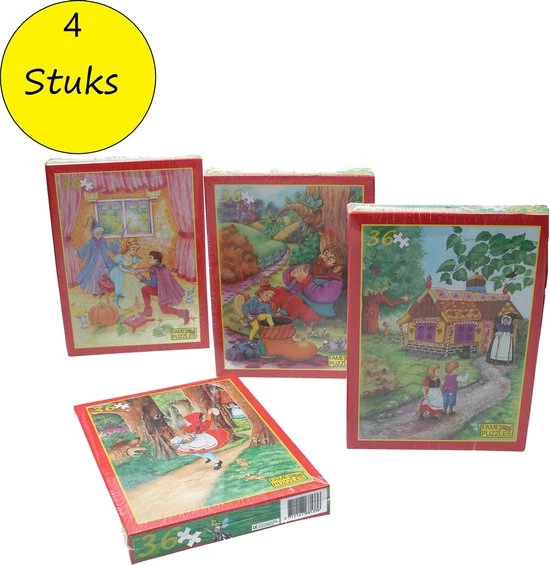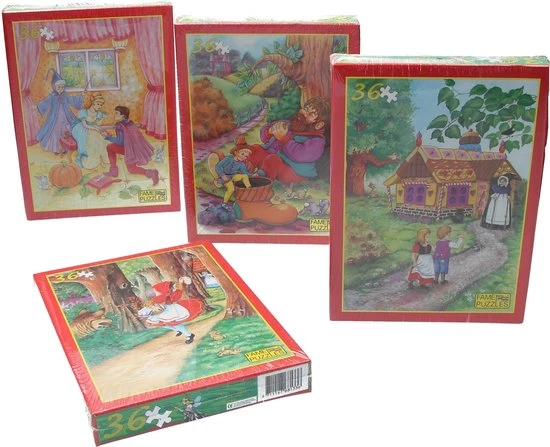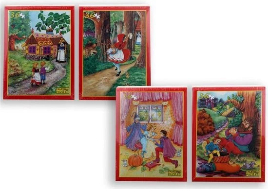Vertel een verhaal zonder worden met deze set van 4 puzzels van Assepoester , Kleinduimpje, roodkapje en Hans & Grietje