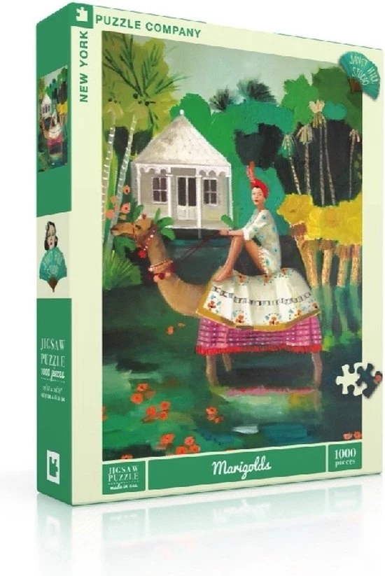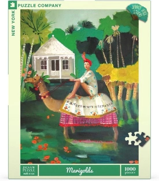 De illustratie op deze puzzel van New York Puzzle Company is geschilderd door Janet Hill en neemt je mee naar een prachtige omgeving met goudsbloemen op de achtergrond en een vrouw zit op een kameel voor een huis op palen. De puzzel heeft 1000 stukjes en heeft een linnen stijl afwerking zodat de puzzel minder glimt. Aanbevolen leeftijd: 13+ jaar.
