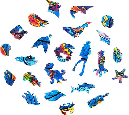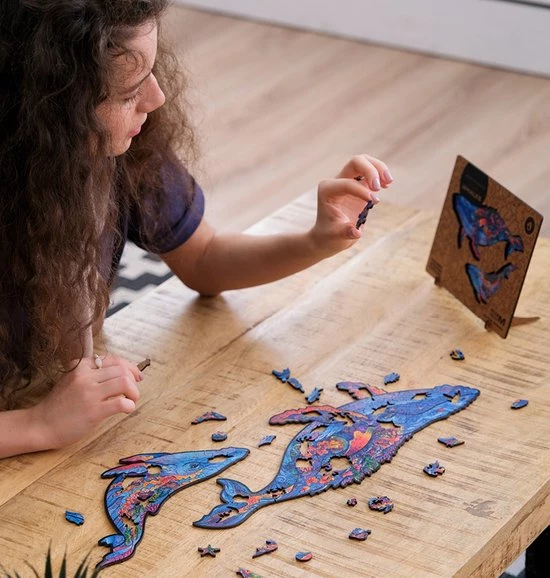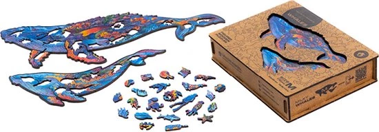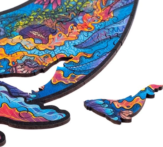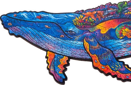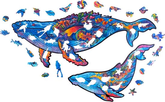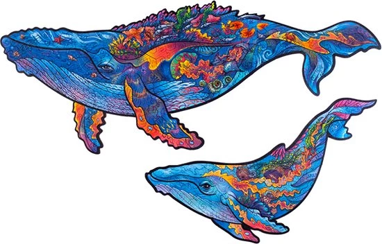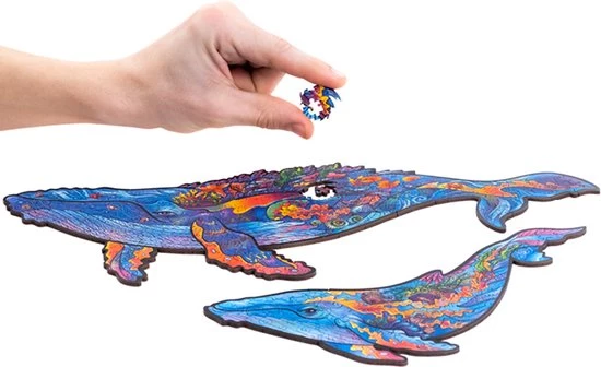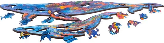 Ontdek de onderwaterwereld met deze prachtige houten puzzel van UNIDRAGON. Je vindt er twee afzonderlijke mozaïeken van walvissen in één doos. Ben je klaar voor een avontuurlijke oceaanreis op de walvisrug? Elk stukje is uniek wat de puzzeltijd nog leuker en plezieriger maakt. Ontdek een pijlstaartrog, octopus, een scala aan koralen en vissen. Zeesterren, de nautilus met zijn gulden snede-spiraal en walvissen die door de zee zweven.